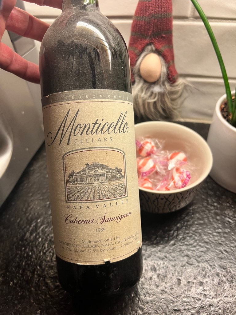 A dear friend sent us holiday tidings, and some photos of one of his wine selections over the holidays. He graced his table with a wonderful forty year old bottle of MONTICELLO Cabernet Sauvignon.